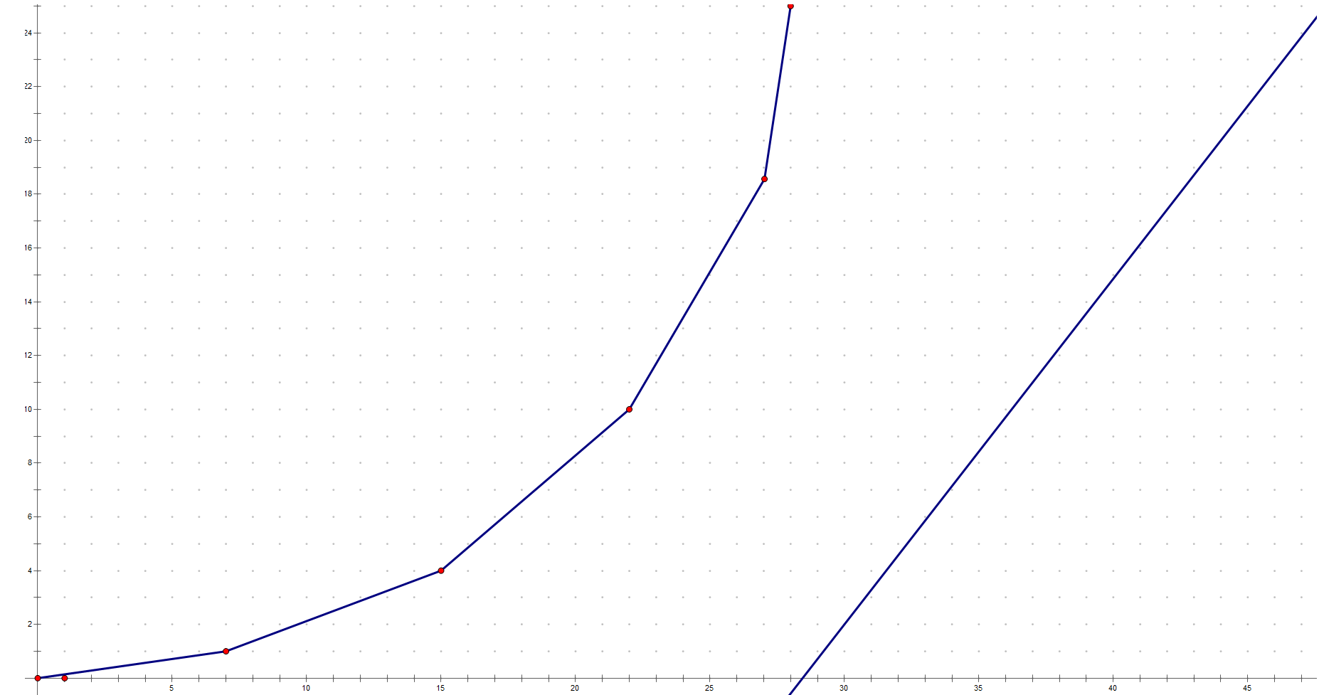 我们使用线性规划进行转化(线性规划大概会在高二学习),我们以$x(j)$为横轴,$y(j)$为纵轴建立平面直角坐标系,这样决策$j$就可以用坐标系上的一个点表示。