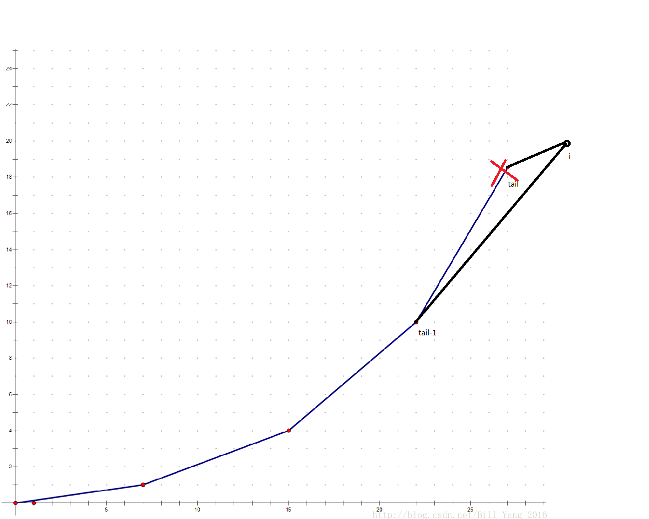 - 计算$x(i),y(i)$,将二元组加入队尾,同时更新凸壳(如图)。