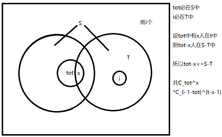如图,当$i$为$t$人代表队最后一名,共有$C_{tot}^xC_{i-1-tot}^{t-x-1}$种合法方案。