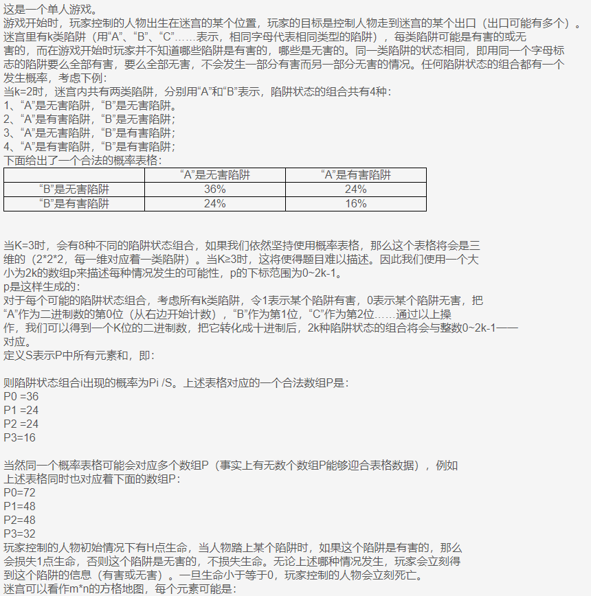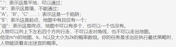 double Dp(int x,int y,int s,int h) { if(map[x][y]=='@')return 1; if(vst[x][y][s][h])return f[x][y][s][h]; vst[x][y][s][h]=1; if(h==0)return f[x][y][s][h]=0; for(int i=0; i<4; i++) { int nx=x+dx[i],ny=y+dy[i],ch=map[nx][ny]-'A'+1; if(nx<1||nx>n||ny<1||ny>m||map[nx][ny]=='#')continue; if(!isalpha(map[nx][ny])||(isalpha(map[nx][ny])&&bit(s,ch)==0))f[x][y][s][h]=max(f[x][y][s][h],Dp(nx,ny,s,h)); else if(bit(s,ch)==1)f[x][y][s][h]=max(f[x][y][s][h],Dp(nx,ny,s,h-1)); else if(bit(s,ch)==2) { int ns=s-Pow[ch-1]; double sum=Dp(nx,ny,ns,h-1)*g[s][ch]; ns-=Pow[ch-1],sum+=Dp(nx,ny,ns,h)*(1-g[s][ch]); f[x][y][s][h]=max(f[x][y][s][h],sum); } } return f[x][y][s][h]; }
