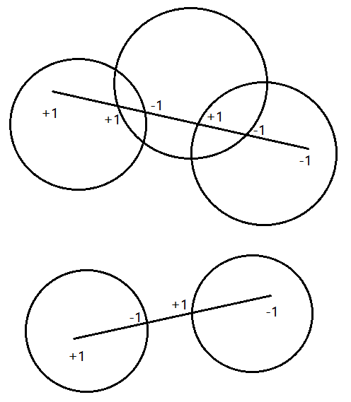如果线段被圆完全覆盖,那么在到达终点前,累加和一定是$>0$的,否则说明线段不被圆完全覆盖。