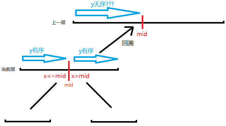 可以发现,此时我们将$x$较小的放在了左边,较大的放在了右边,分割线为$mid$,且左右区间$y$均有序。1